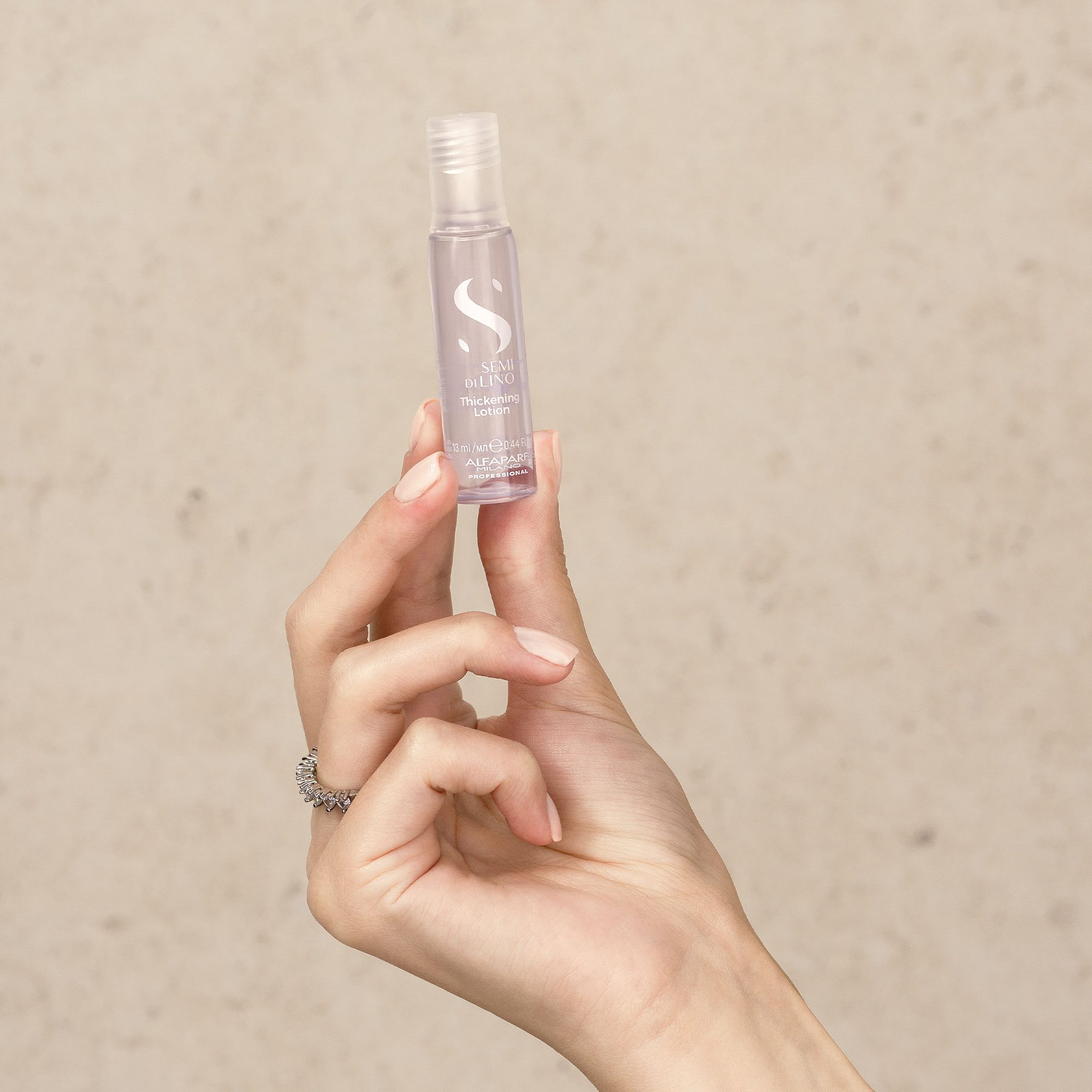 Η Alfaparf Semi di Lino Density Thickening Lotion είναι μια εξειδικευμένη θεραπευτική λοσιόν ενδυνάμωσης και πύκνωσης, ειδικά σχεδιασμένη για λεπτά, αδύναμα ή αραιωμένα μαλλιά. Χάρη στην προηγμένη τεχνολογία της, ενισχύει άμεσα τη δομή της τρίχας, χαρίζοντας όγκο, σώμα και αίσθηση πυκνότητας με φυσική κίνηση.