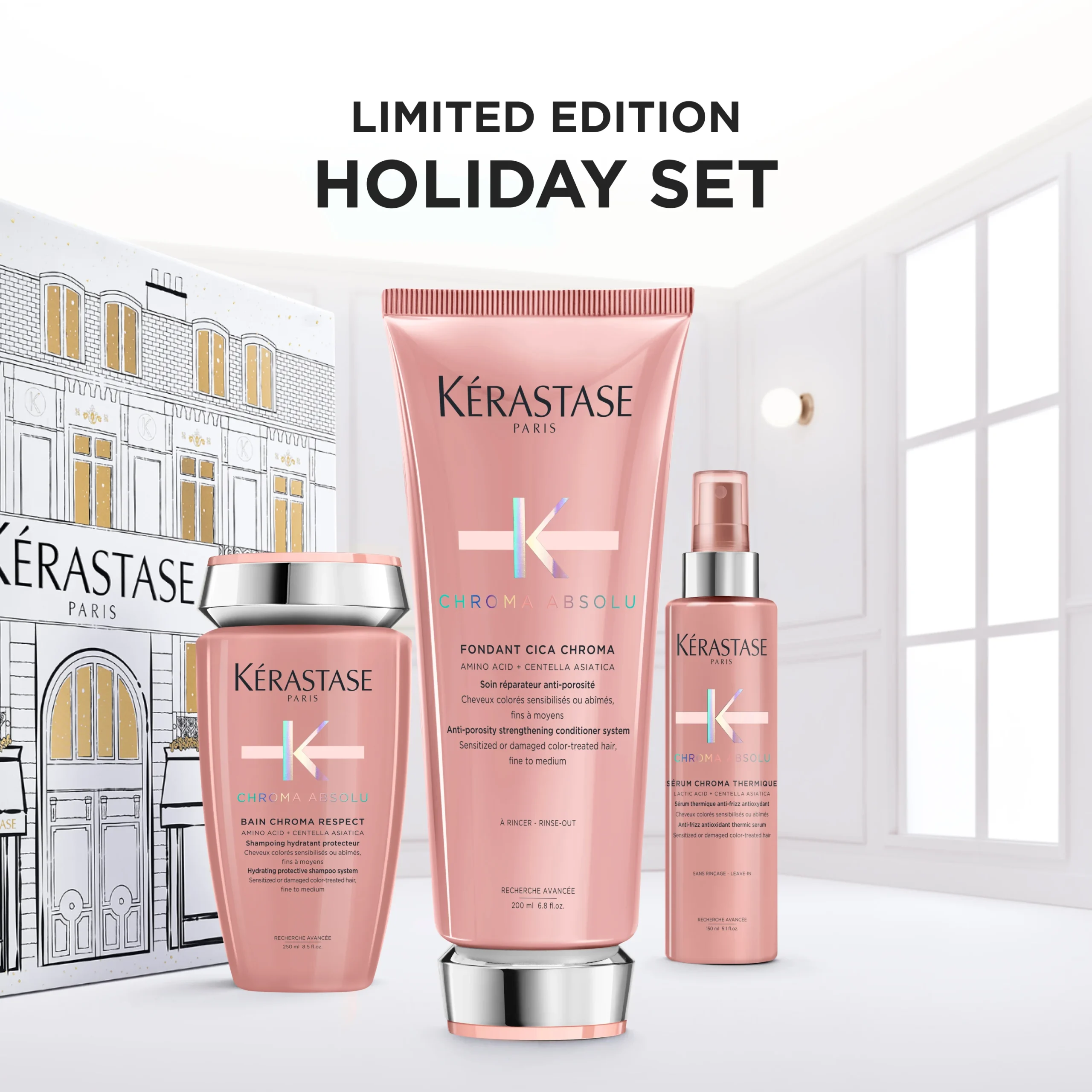 Το Kérastase Chroma Absolu Limited Edition Set είναι ένα premium σετ περιορισμένης κυκλοφορίας, ειδικά σχεδιασμένο για βαμμένα, ευαισθητοποιημένα ή ταλαιπωρημένα μαλλιά που χρειάζονται ενυδάτωση, λείανση και προστασία χρώματος μεγάλης διάρκειας. Περιλαμβάνει τρία κορυφαία προϊόντα της σειράς Chroma Absolu, που προστατεύουν το χρώμα, μειώνουν το φριζάρισμα και ενδυναμώνουν την τρίχα, χαρίζοντας επαγγελματικό αποτέλεσμα στο σπίτι.