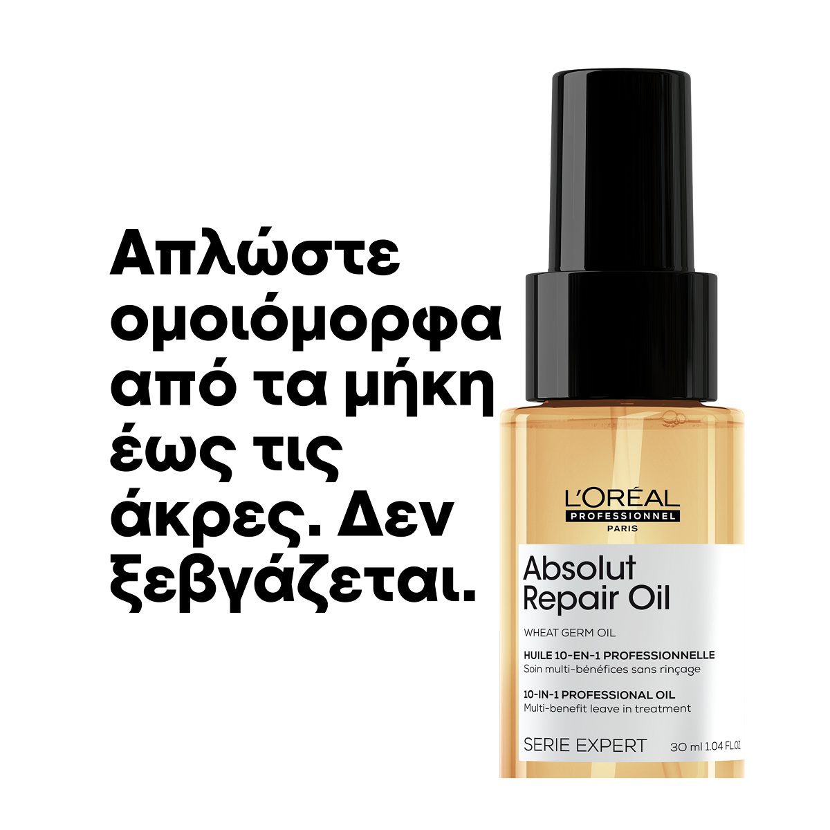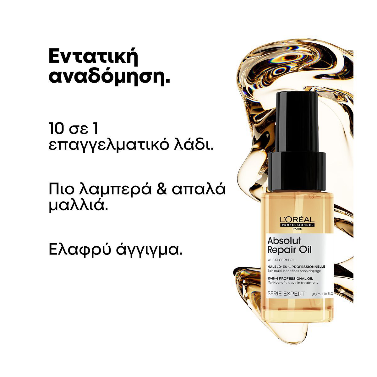 Το Absolut Repair Oil της L’Oréal Professionnel είναι ένα ελαφρύ αλλά εξαιρετικά θρεπτικό έλαιο που χαρίζει στα μαλλιά άμεση απαλότητα, λάμψη και προστασία. Σχεδιασμένο για όλους τους τύπους μαλλιών, ακόμα και για τα πιο ευαίσθητα, απορροφάται άμεσα χωρίς να βαραίνει, προσφέροντας επαγγελματικό αποτέλεσμα από την πρώτη χρήση.